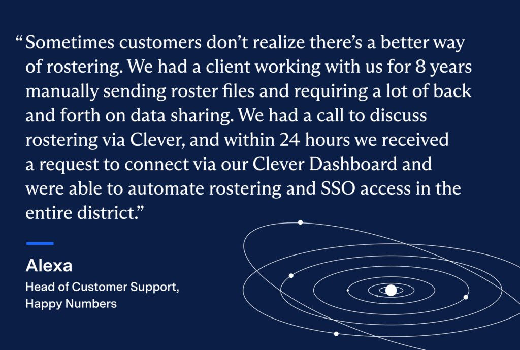 Happy Numbers experienced substantial growth during the pandemic in 2020. This surge in customers underscored the need for an efficient rollout of their program to a large audience of teachers and students. Before Clever, their Implementations Team worked with schools to manually match their rostering needs and formats. They were often using .csv files, which meant that rolling out their tools to millions of students could take over a week for each individual customer. What’s more, keeping rosters up-to-date required a lot of manual work for an already overburdened team.